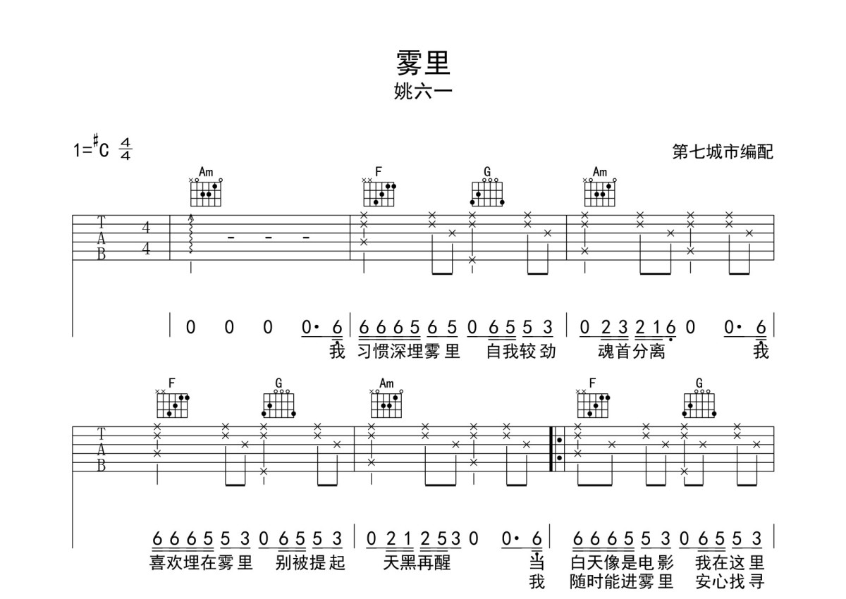 姚六一《雾里》吉他谱 - C调弹唱六线谱