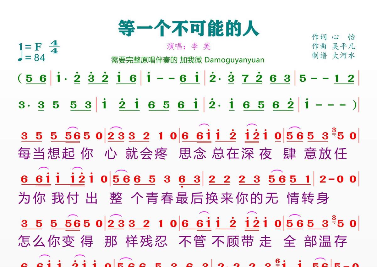 《等一个不可能的人》是李英演唱的一首歌曲,拍号为4/4拍,歌曲速度为每分钟84拍,这份简谱共有一张高清图谱,图谱由 @临海雪原 编配上传。