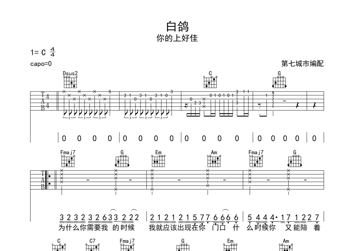 你的上好佳《白鸽》吉他谱 - C调弹唱六线谱