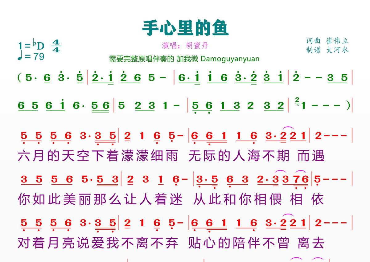 《手心里的鱼》是胡蜜丹演唱的一首歌曲,拍号为4/4拍,歌曲速度为每分钟79拍,这份简谱共有一张高清图谱,图谱由 @临海雪原 编配上传。