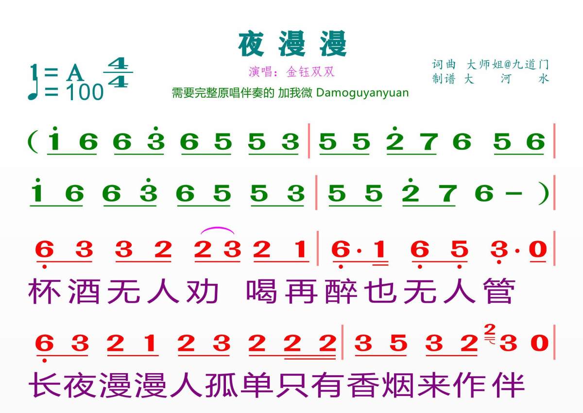 《夜漫漫》是金钰双双演唱的一首歌曲,拍号为4/4拍,歌曲速度为每分钟100拍,这份简谱共有一张高清图谱,图谱由 @临海雪原 编配上传。