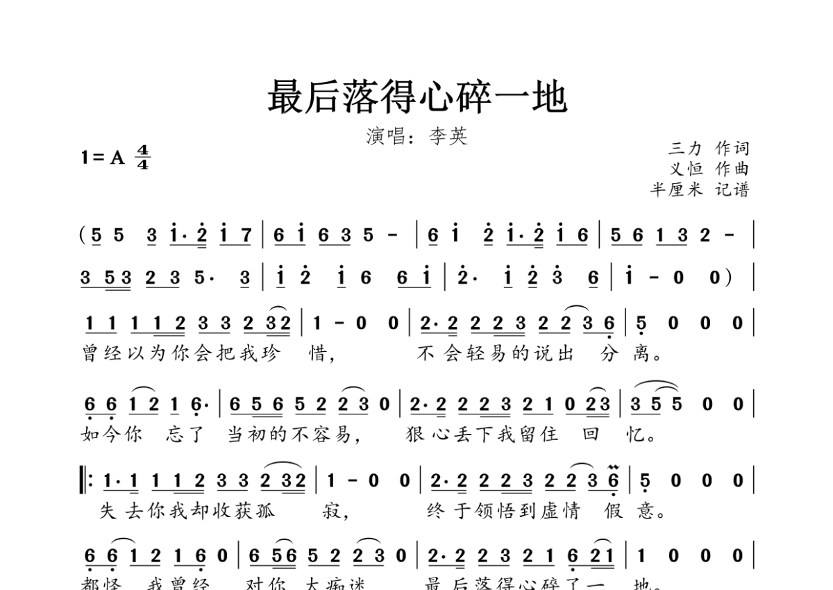 《最后落得心碎一地》是李英演唱的一首歌曲,拍号为4/4拍,这份简谱共有一张高清图谱,图谱由 @海 编配上传。