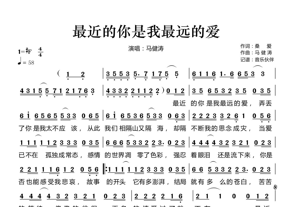 《最近的你是我最远的爱》是马健涛演唱的一首歌曲,拍号为4/4拍,歌曲速度为每分钟58拍,这份简谱共有一张高清图谱,图谱由 @音乐伙伴 编配上传。