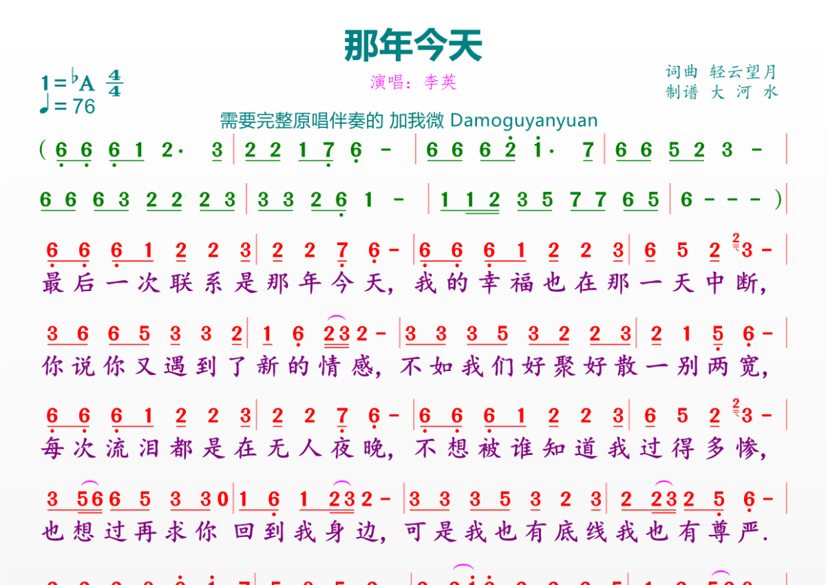 《那年今天》是李英演唱的一首歌曲,拍号为4/4拍,歌曲速度为每分钟76拍,这份简谱共有一张高清图谱,图谱由 @临海雪原 编配上传。