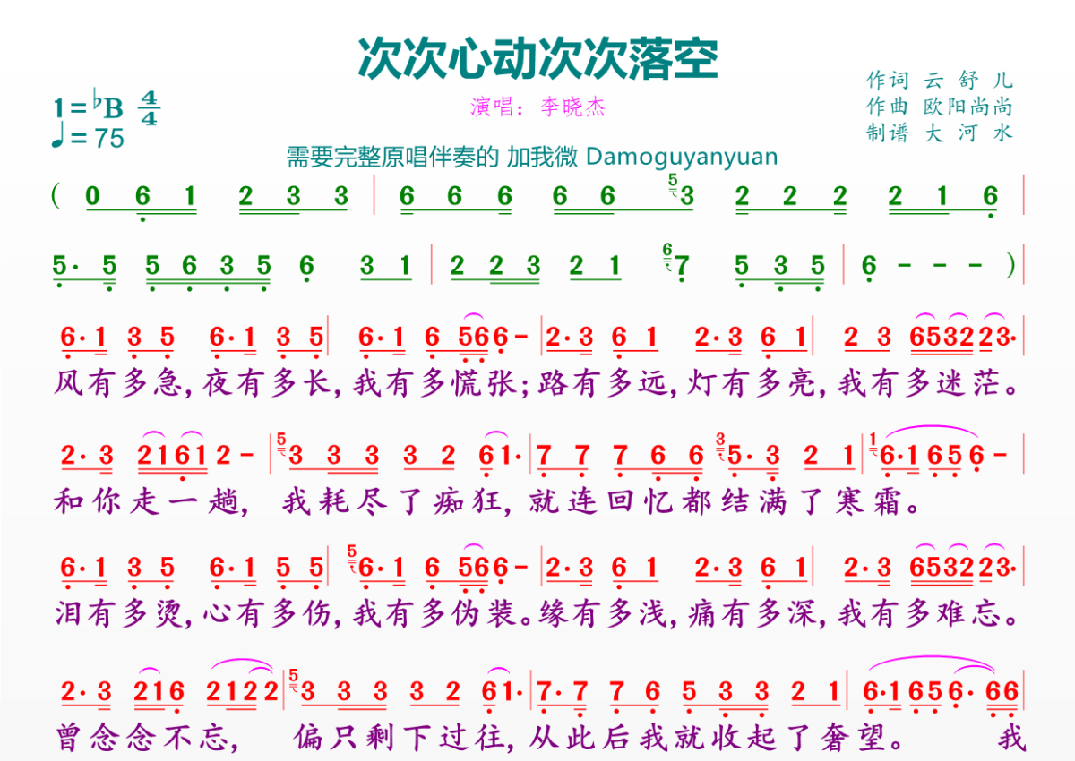 《次次心动次次落空》是李晓杰演唱的一首歌曲,拍号为4/4拍,歌曲速度为每分钟75拍,这份简谱共有一张高清图谱,图谱由 @临海雪原 编配上传。