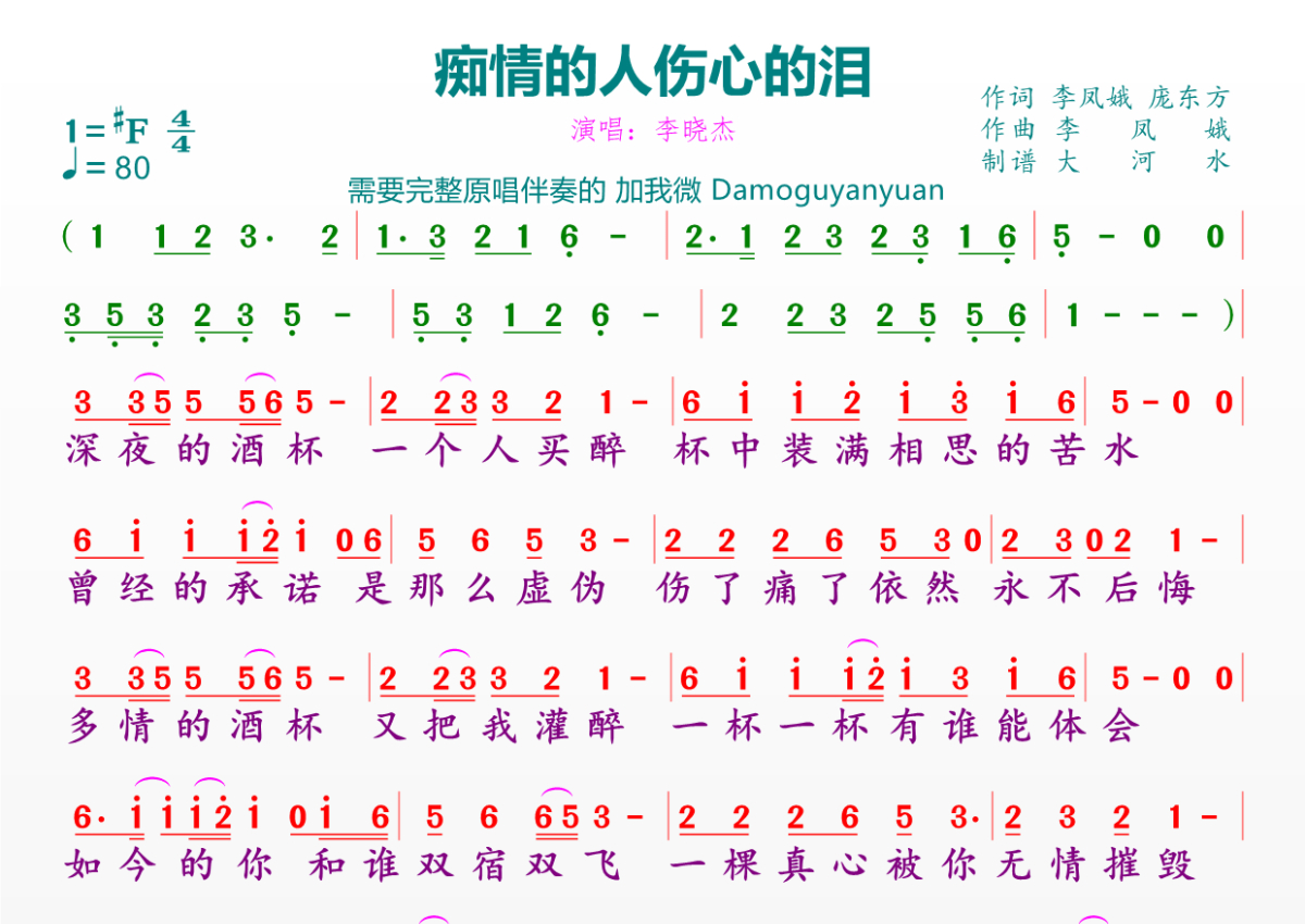 《痴情的人伤心的泪》是李晓杰演唱的一首歌曲,拍号为4/4拍,歌曲速度为每分钟80拍,这份简谱共有一张高清图谱,图谱由 @临海雪原 编配上传。