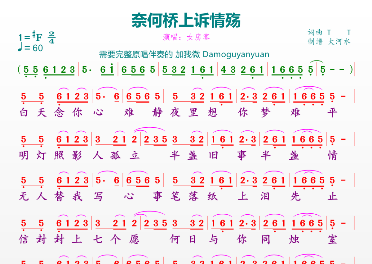 《奈何桥上诉情殇》是女房客演唱的一首歌曲,拍号为2/4拍,歌曲速度为每分钟60拍,这份简谱共有一张高清图谱,图谱由 @临海雪原 编配上传。