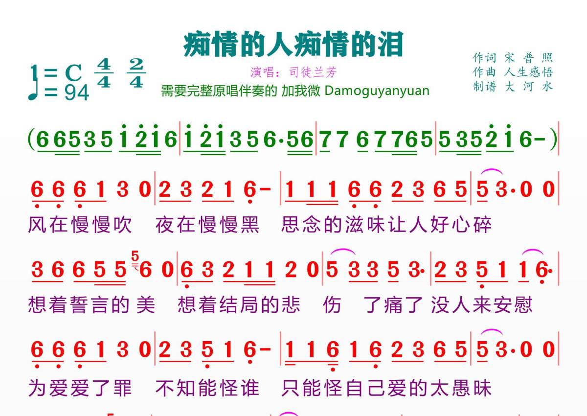 《痴情的人痴情的泪》是司徒兰芳演唱的一首歌曲,拍号为4/4拍,歌曲速度为每分钟94拍,这份简谱共有一张高清图谱,图谱由 @临海雪原 编配上传。