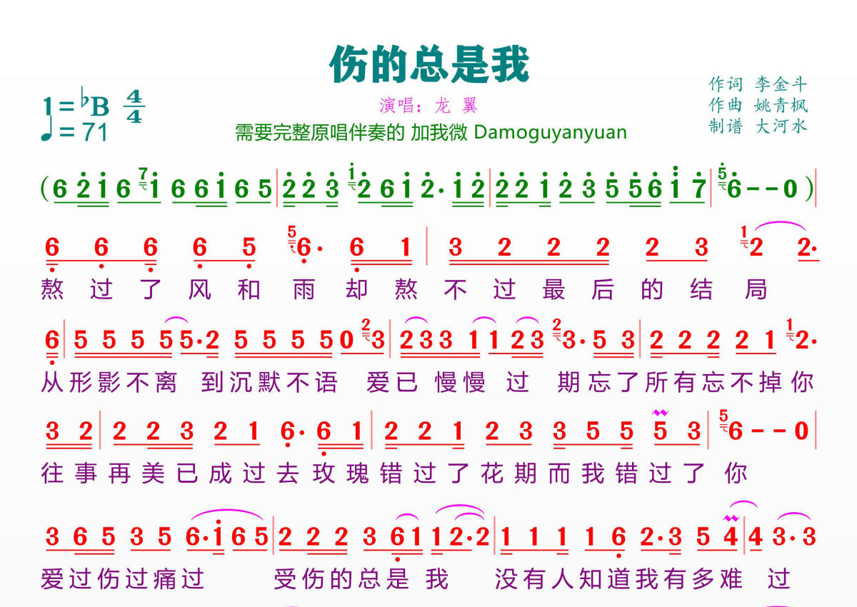 《伤的总是我》是龙翼演唱的一首歌曲,拍号为4/4拍,歌曲速度为每分钟71拍,这份简谱共有一张高清图谱,图谱由 @临海雪原 编配上传。
