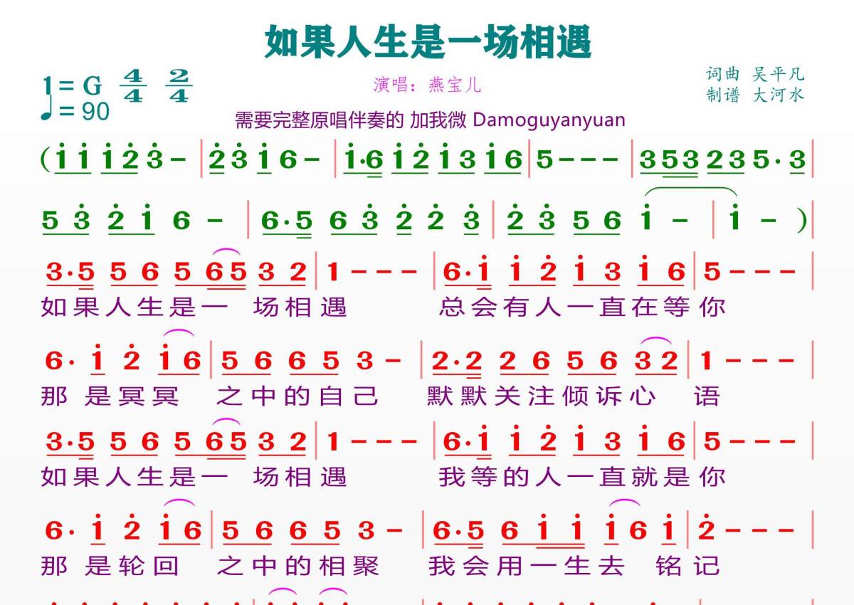 《如果人生是一场相遇》是燕宝儿演唱的一首歌曲,拍号为4/4拍,歌曲速度为每分钟90拍,这份简谱共有一张高清图谱,图谱由 @临海雪原 编配上传。