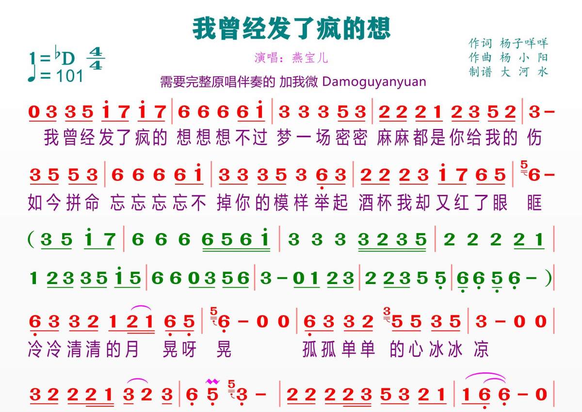 我曾发了疯的想简谱 - 燕宝儿演唱