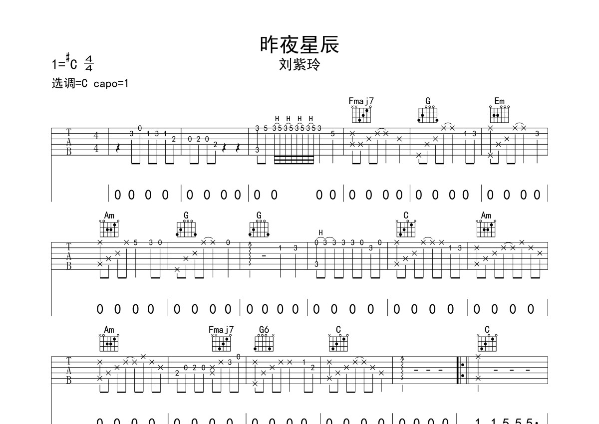 刘紫玲《昨夜星辰》吉他谱 - C调弹唱六线谱