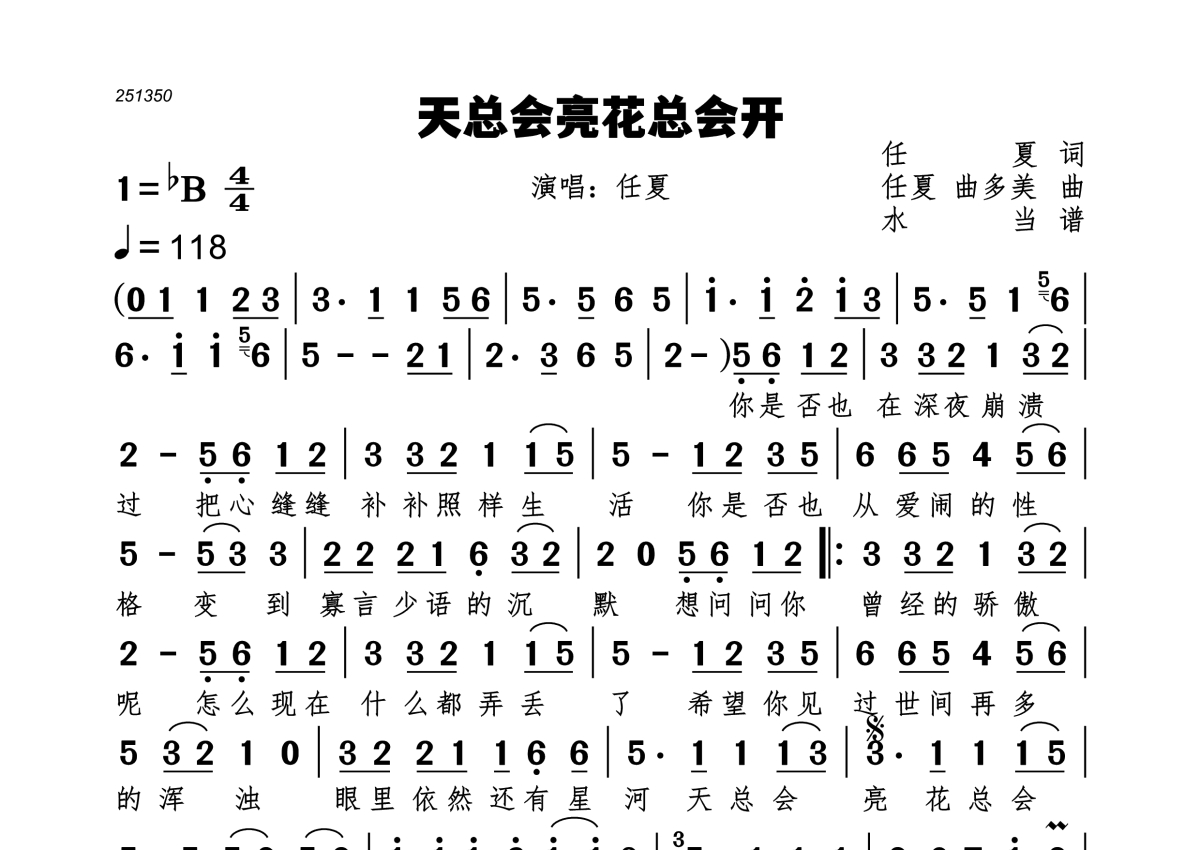 《天总会亮花总会开》是任夏演唱的一首歌曲,拍号为4/4拍,歌曲速度为每分钟118拍,这份简谱共有一张高清图谱,图谱由 @水当 编配上传。