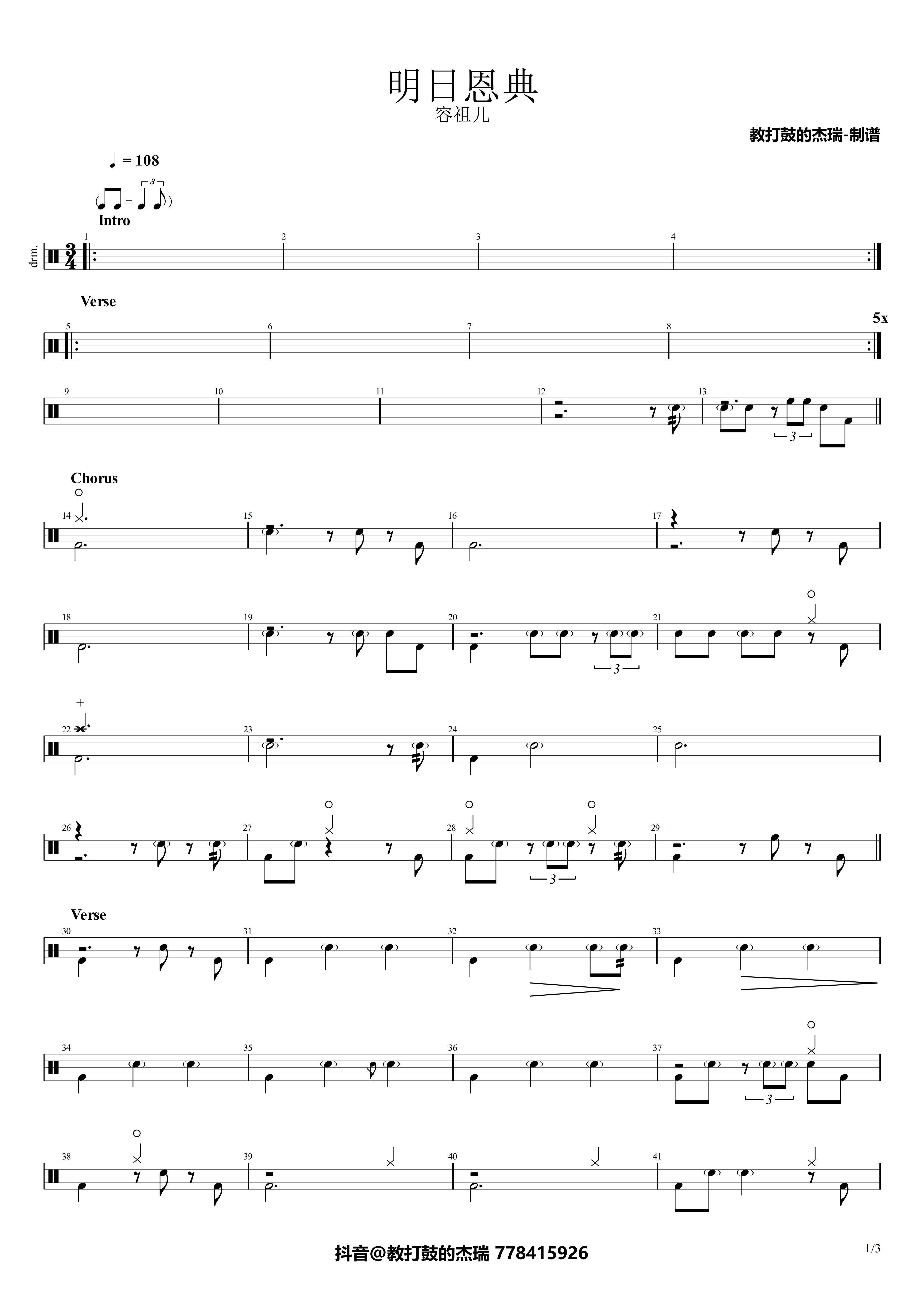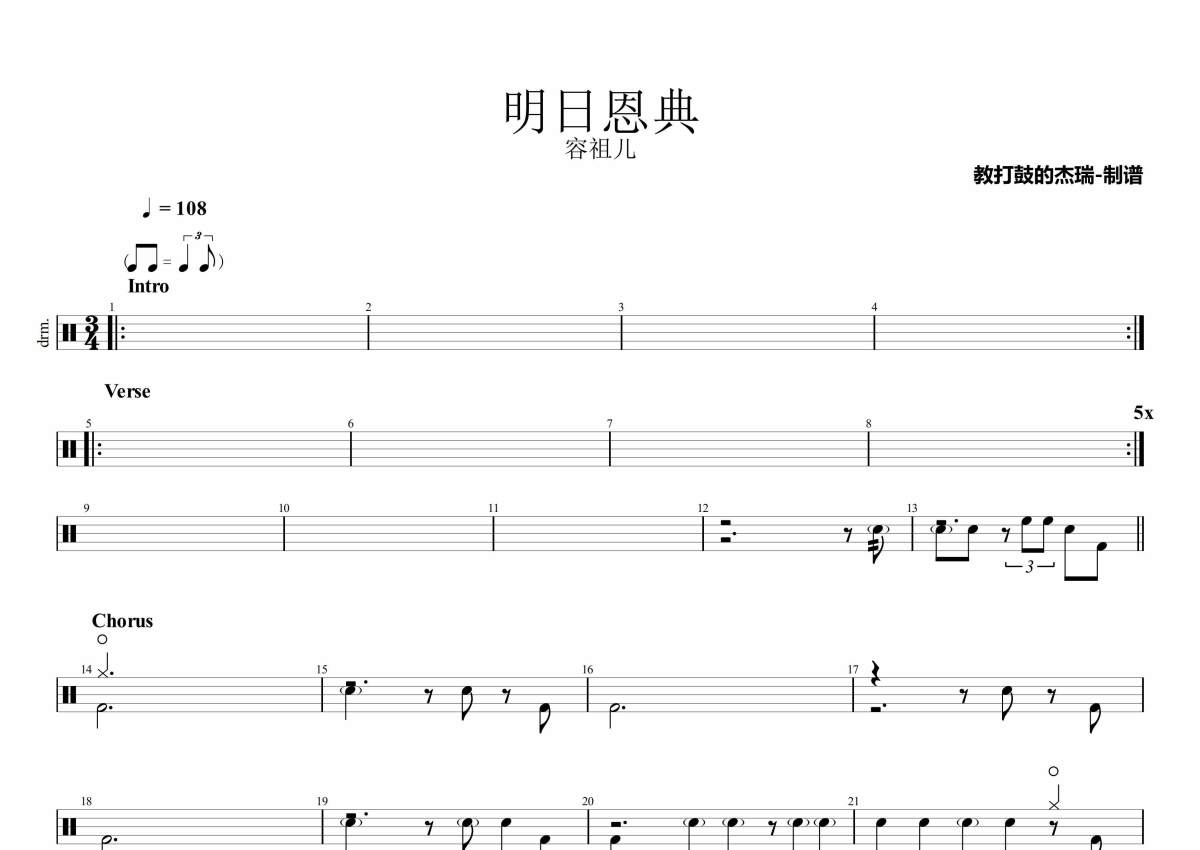 《明日恩典》是容祖儿演唱的一首歌曲,拍号为3/4拍,歌曲速度为每分钟108拍,这份架子鼓谱共有三张高清图谱,图谱由 @Jerry 编配上传,图谱使用五线谱编配,使用这份明日恩典架子鼓谱,你将能够轻松地敲打出这首容祖儿的明日恩典,快来尝试吧。