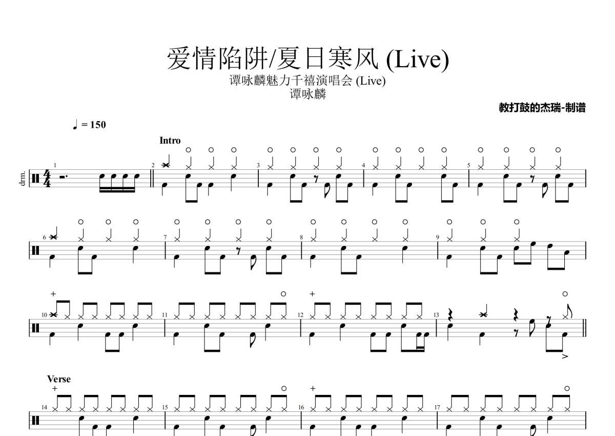 《爱情陷阱+夏日寒风 (Live)》是谭咏麟演唱的一首歌曲,谭咏麟魅力千禧演唱会 (Live),拍号为4/4拍,歌曲速度为每分钟150拍,这份架子鼓谱共有六张高清图谱,图谱由 @Jerry 编配上传,图谱使用五线谱编配,使用这份爱情陷阱+夏日寒风 (Live)架子鼓谱,你将能够轻松地敲打出这首谭咏麟的爱情陷阱+夏日寒风 (Live),快来尝试吧。