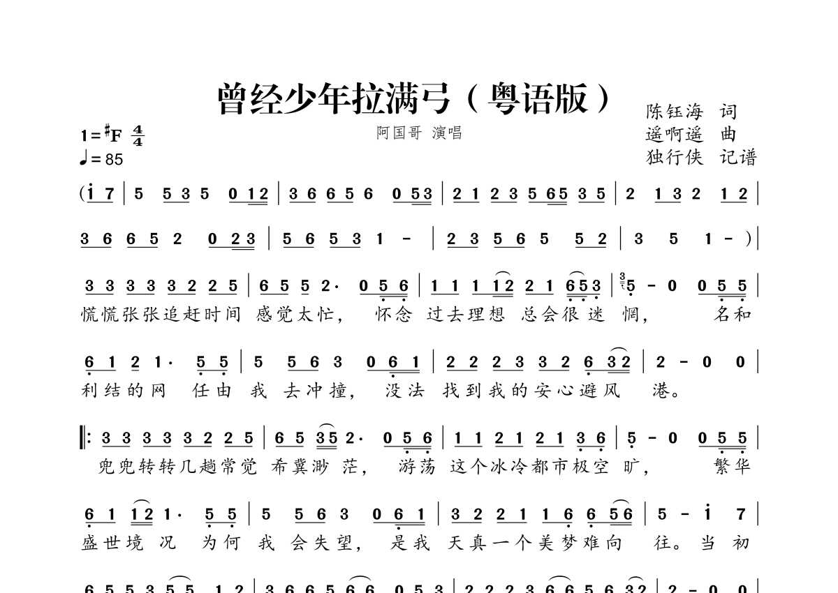 《曾经少年拉满弓(粤语版)》是阿国哥演唱的一首歌曲,拍号为4/4拍,歌曲速度为每分钟85拍,这份简谱共有一张高清图谱,图谱由 @独行侠 编配上传。
