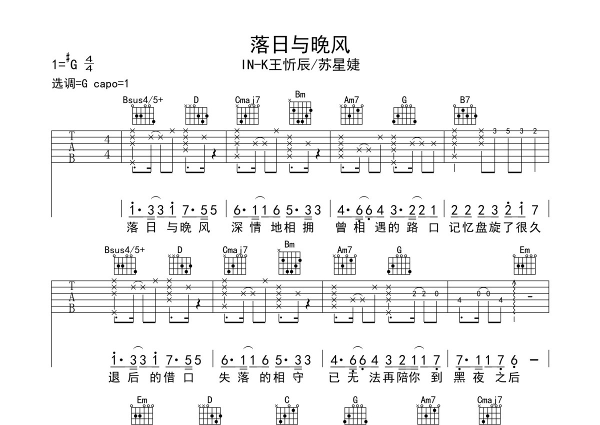 王忻辰/苏星婕《落日与晚风》吉他谱 - G调弹唱六线谱