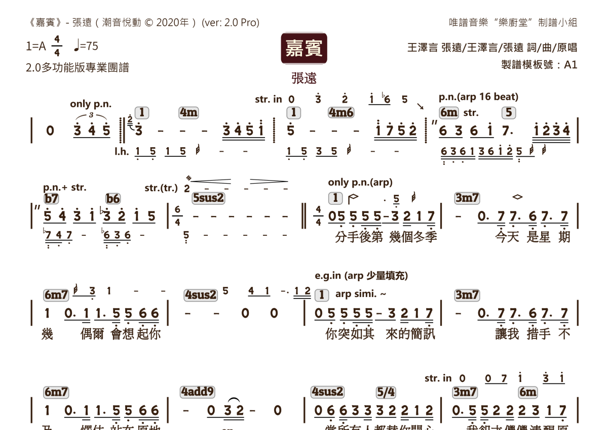 “乐厨堂”乐谱发布小组: 出版级乐谱扒谱制谱——以职业乐手圈通行标准记谱,遵循原版和声、伴奏元素和段落结构。 ❶ 2.0多功能专业团谱:采用台湾卓著公司开创的二代简谱标准制作。二代简谱无疑是迄今为止最科学、最易读的专业范畴多功能记谱方案:❷ 框架谱:采用职业乐手通常记谱方案制作。