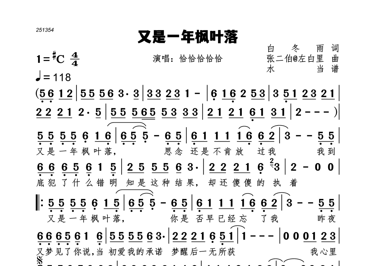《又是一年枫叶落》是恰恰恰恰恰演唱的一首歌曲,拍号为4/4拍,歌曲速度为每分钟118拍,这份简谱共有一张高清图谱,图谱由 @水当 编配上传。