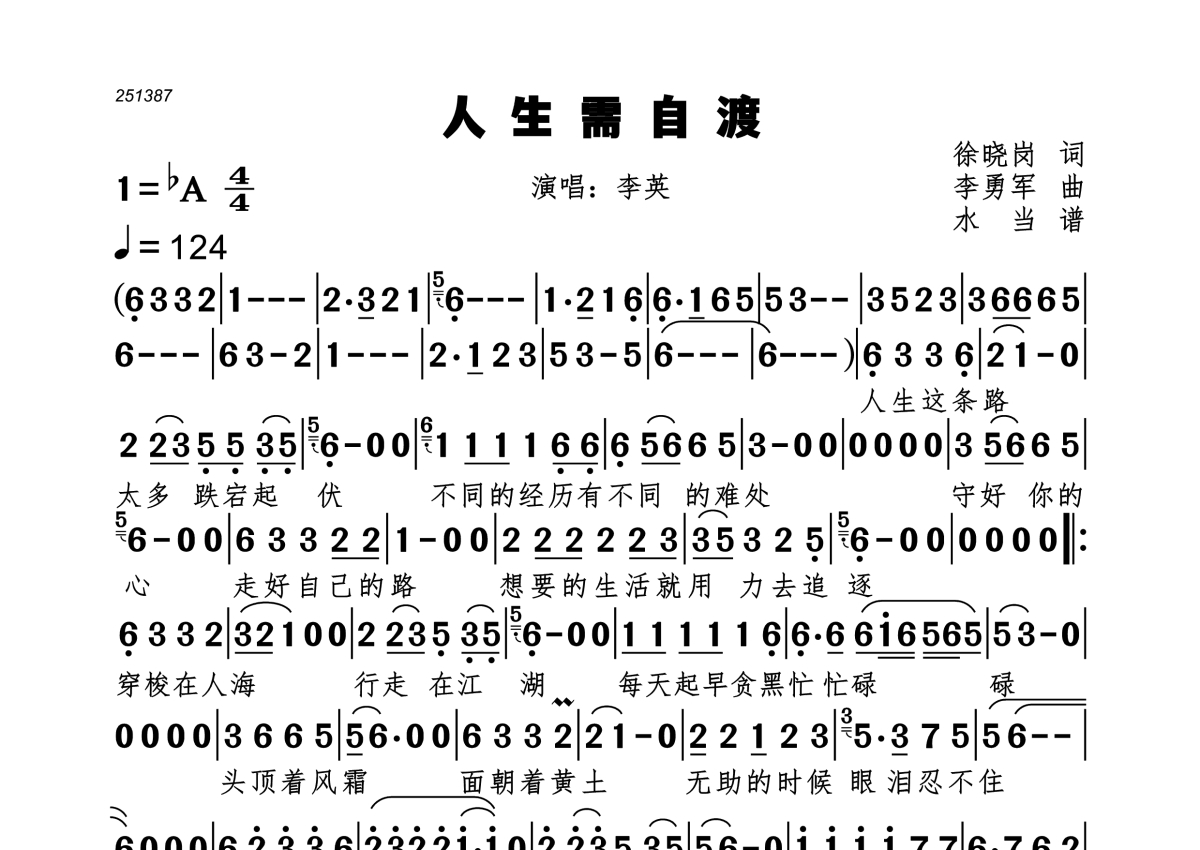 《人生需自渡》是李英演唱的一首歌曲,拍号为4/4拍,歌曲速度为每分钟124拍,这份简谱共有一张高清图谱,图谱由 @水当 编配上传。