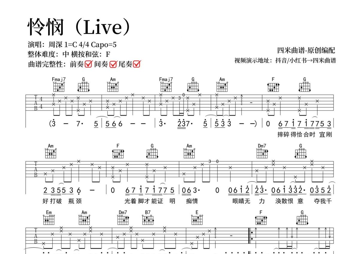 周深周深《怜悯》吉他谱 - C调弹唱六线谱