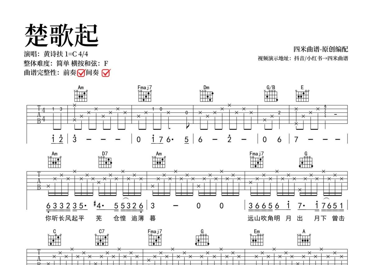 黄诗扶《楚歌起》吉他谱 - C调弹唱六线谱