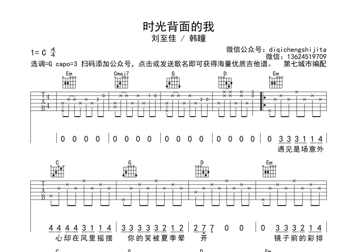 《时光背面的我》是刘至佳/韩瞳演唱的一首歌曲,本吉他谱采用的是G调指法编配,这份吉他谱共有三张高清图谱,图谱由 @第七城市 编配上传,图谱使用六线谱编配,包含吉他和弦指法、简谱以及歌词部分,使用这份时光背面的我吉他谱,可以让你更加方便地掌握这首歌曲的弹唱技巧,快来尝试吧。刘至佳/韩瞳《时光背面的我》吉他谱_G调吉他弹唱谱。