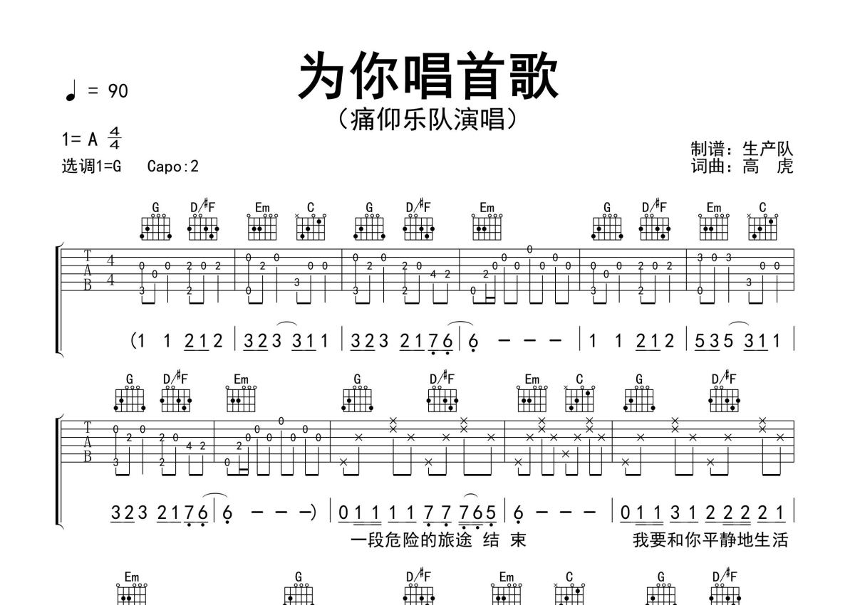 《为你唱首歌》是痛仰乐队演唱的一首歌曲,精编完美版,拍号为4/4拍,歌曲速度为每分钟90拍,歌曲原调为A调,但由于原调指法比较难,为了方便弹奏,本吉他谱采用的是G调指法编配,变调夹2品弹奏即为原调,当然也可以根据自己的音域改变变调夹位置,或者通过改变和弦调性,以方便自己弹奏,这份吉他谱共有三张高清图谱,图谱由 @生产队 编配上传,图谱使用六线谱编配,包含吉他和弦指法、简谱以及歌词部分,使用这份为你唱首歌吉他谱,可以让你更加方便地掌握这首歌曲的弹唱技巧,快来尝试吧。痛仰乐队演唱的歌曲《为你唱首歌》原版吉他谱,含前奏、间奏、尾奏solo编配,精编完美版,优质推荐!。