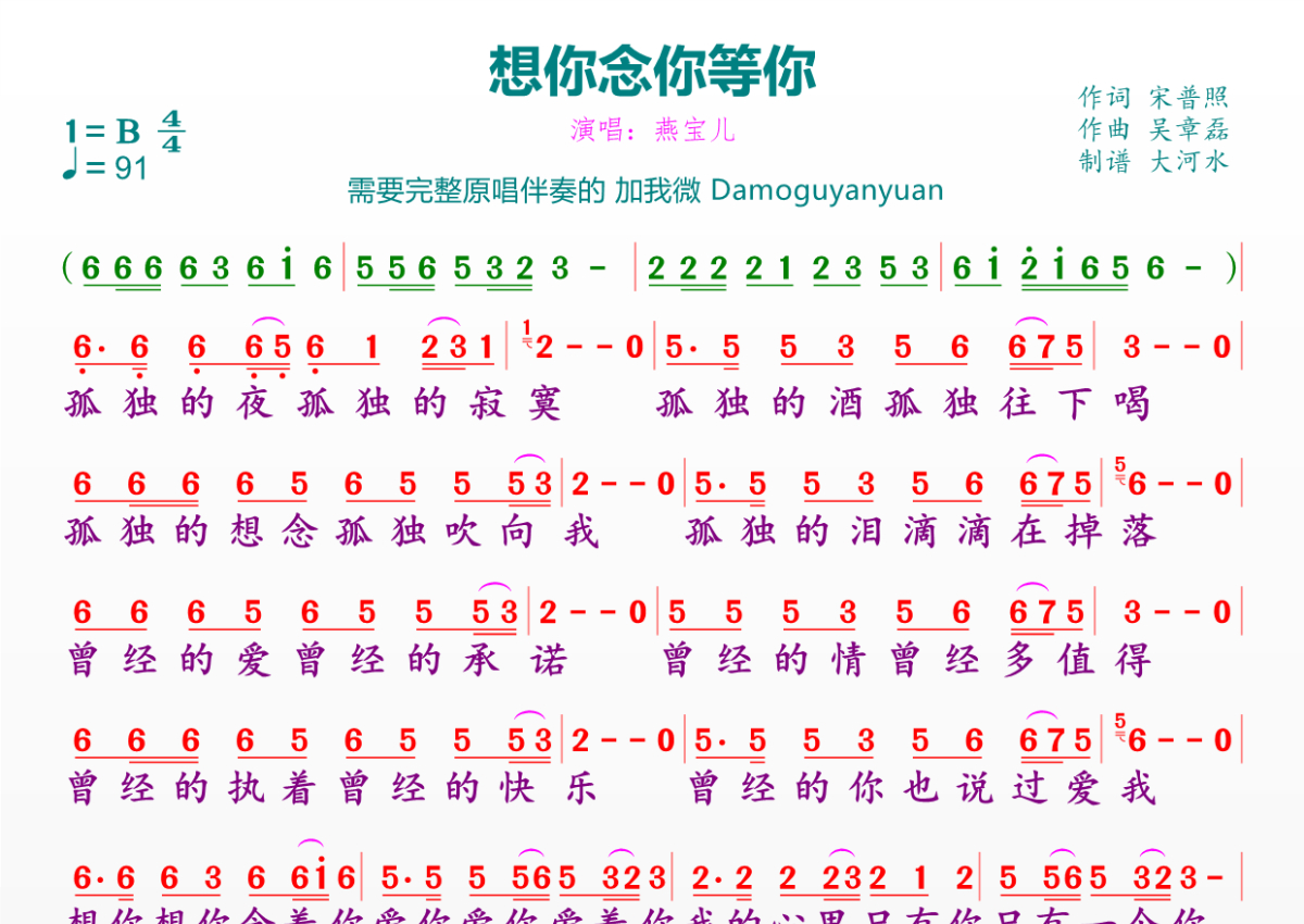 想你念你等你简谱 - 燕宝儿演唱