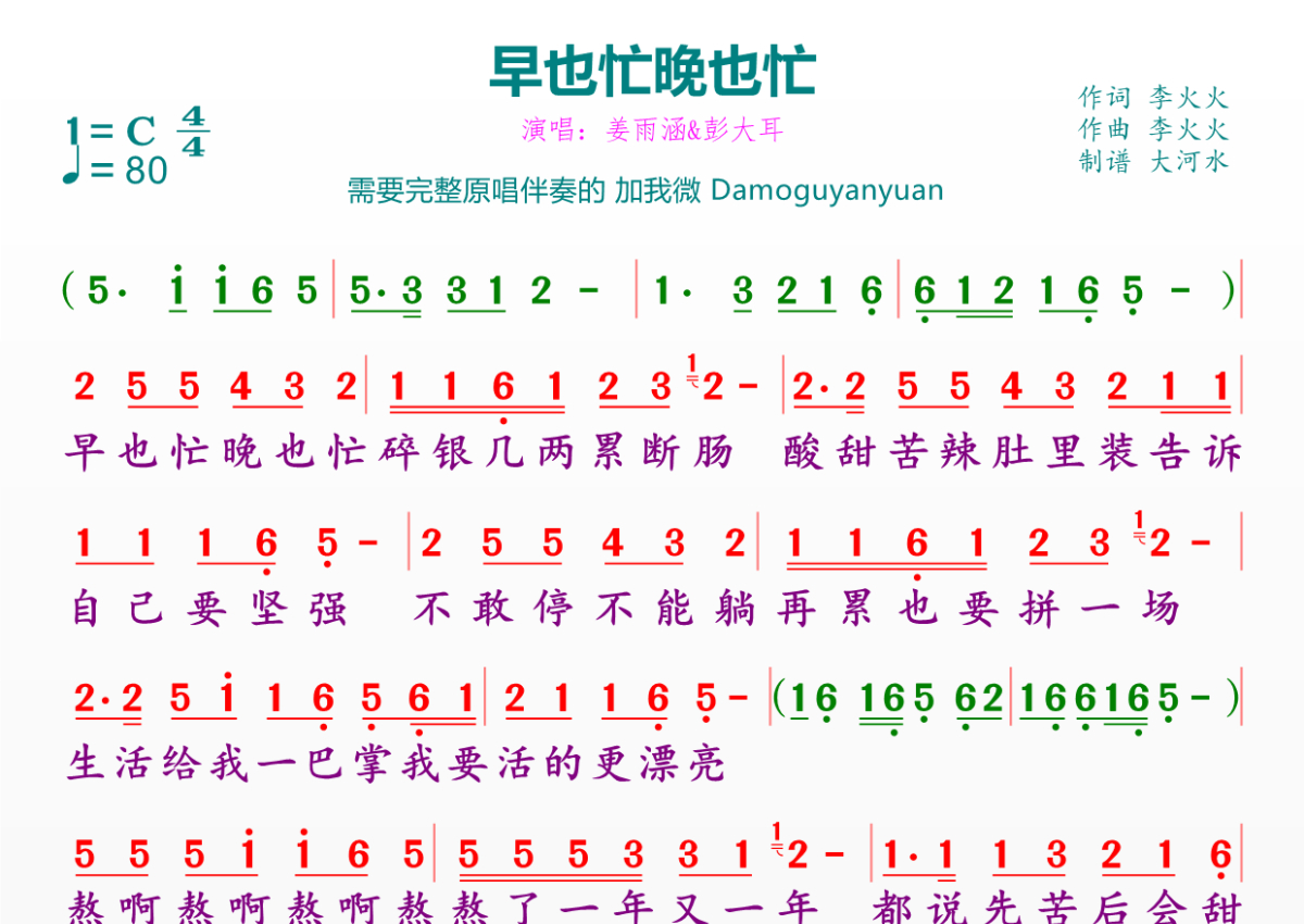 早也忙晚也忙简谱 - 姜雨涵&彭大耳演唱