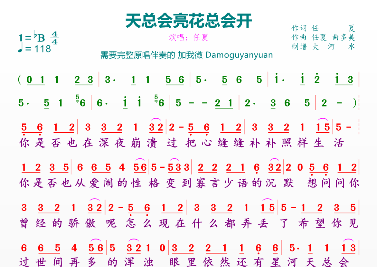 《天总会亮花总会开》简谱 - 任夏