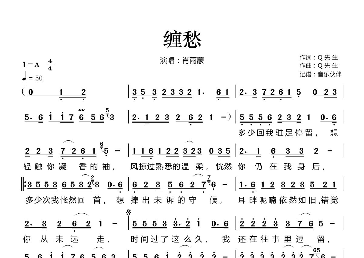 《缠愁》是肖雨蒙演唱的一首歌曲,拍号为4/4拍,歌曲速度为每分钟50拍,这份简谱共有一张高清图谱,图谱由 @音乐伙伴 编配上传。