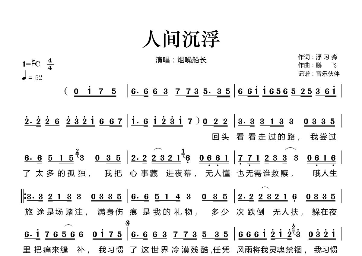 《人间沉浮》是烟嗓船长演唱的一首歌曲,拍号为4/4拍,歌曲速度为每分钟52拍,这份简谱共有一张高清图谱,图谱由 @音乐伙伴 编配上传。