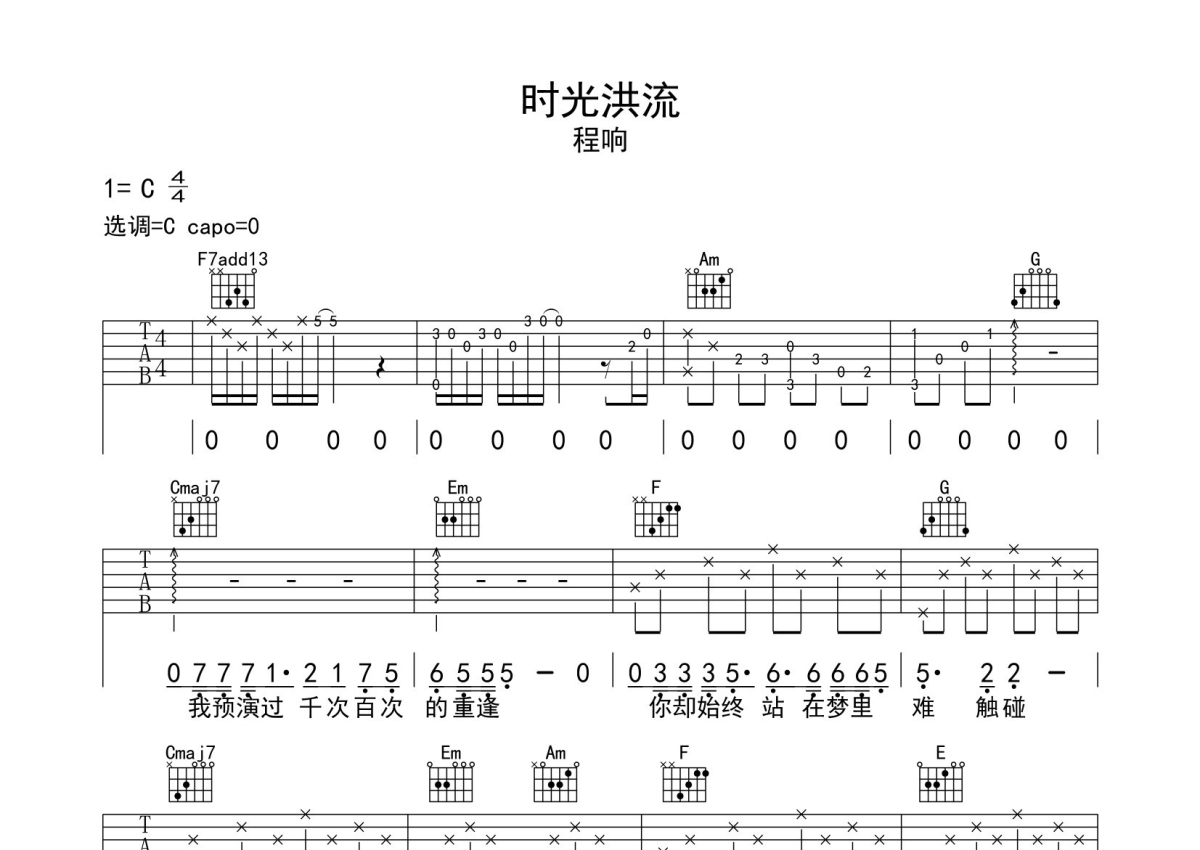 程响《时光洪流》吉他谱 - C调弹唱六线谱