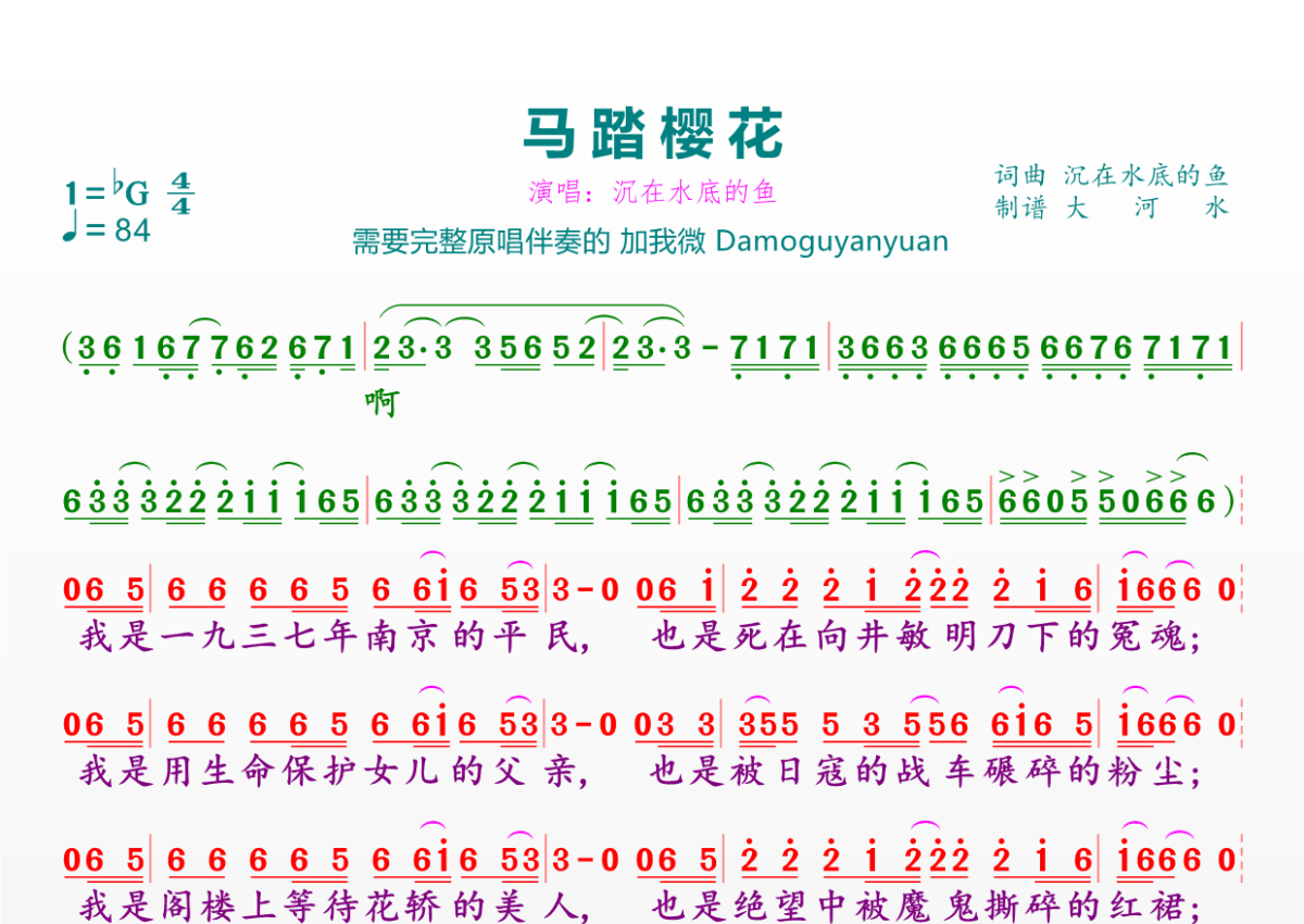 马踏樱花简谱 - 沉在水底的鱼演唱