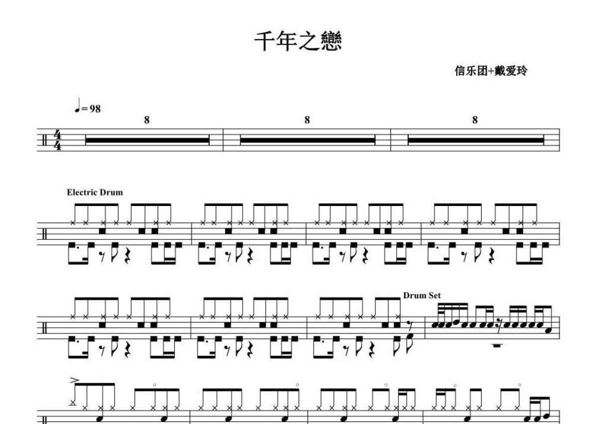《千年之恋》是信乐团、戴爱玲演唱的一首歌曲,拍号为4/4拍,歌曲速度为每分钟98拍,这份架子鼓谱共有三张高清图谱,图谱由 @音符喷血者 编配上传,图谱使用五线谱编配,使用这份千年之恋架子鼓谱,你将能够轻松地敲打出这首信乐团、戴爱玲的千年之恋,快来尝试吧。