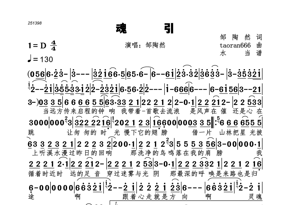 《魂引》是邹陶然演唱的一首歌曲,拍号为4/4拍,歌曲速度为每分钟130拍,这份简谱共有一张高清图谱,图谱由 @水当 编配上传。