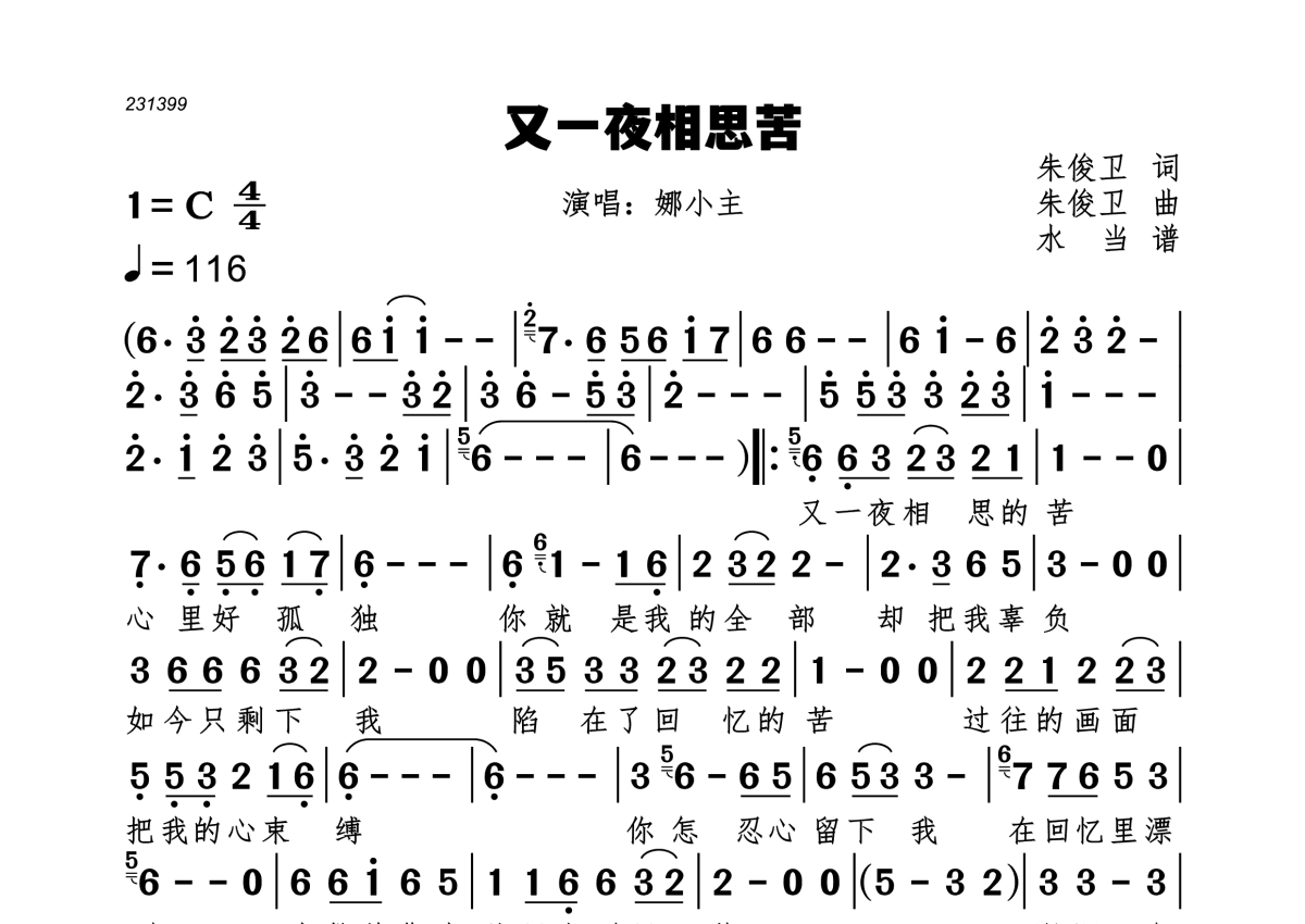 《又一夜相思苦》是娜小主演唱的一首歌曲,拍号为4/4拍,歌曲速度为每分钟116拍,这份简谱共有一张高清图谱,图谱由 @水当 编配上传。