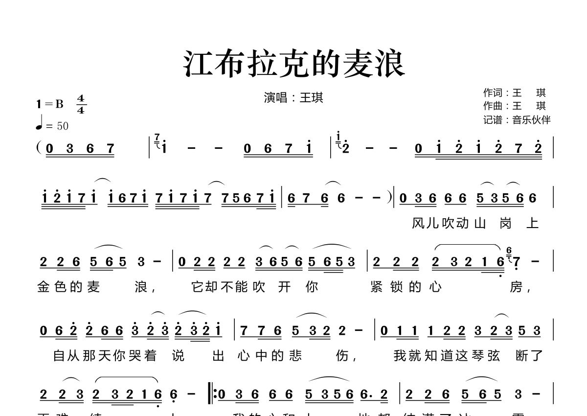 《江布拉克的麦浪》是王琪演唱的一首歌曲,拍号为4/4拍,歌曲速度为每分钟50拍,这份简谱共有两张高清图谱,图谱由 @音乐伙伴 编配上传。