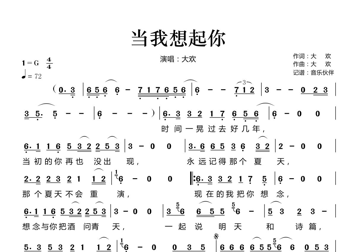《当我想起你》是大欢演唱的一首歌曲,拍号为4/4拍,歌曲速度为每分钟72拍,这份简谱共有一张高清图谱,图谱由 @音乐伙伴 编配上传。
