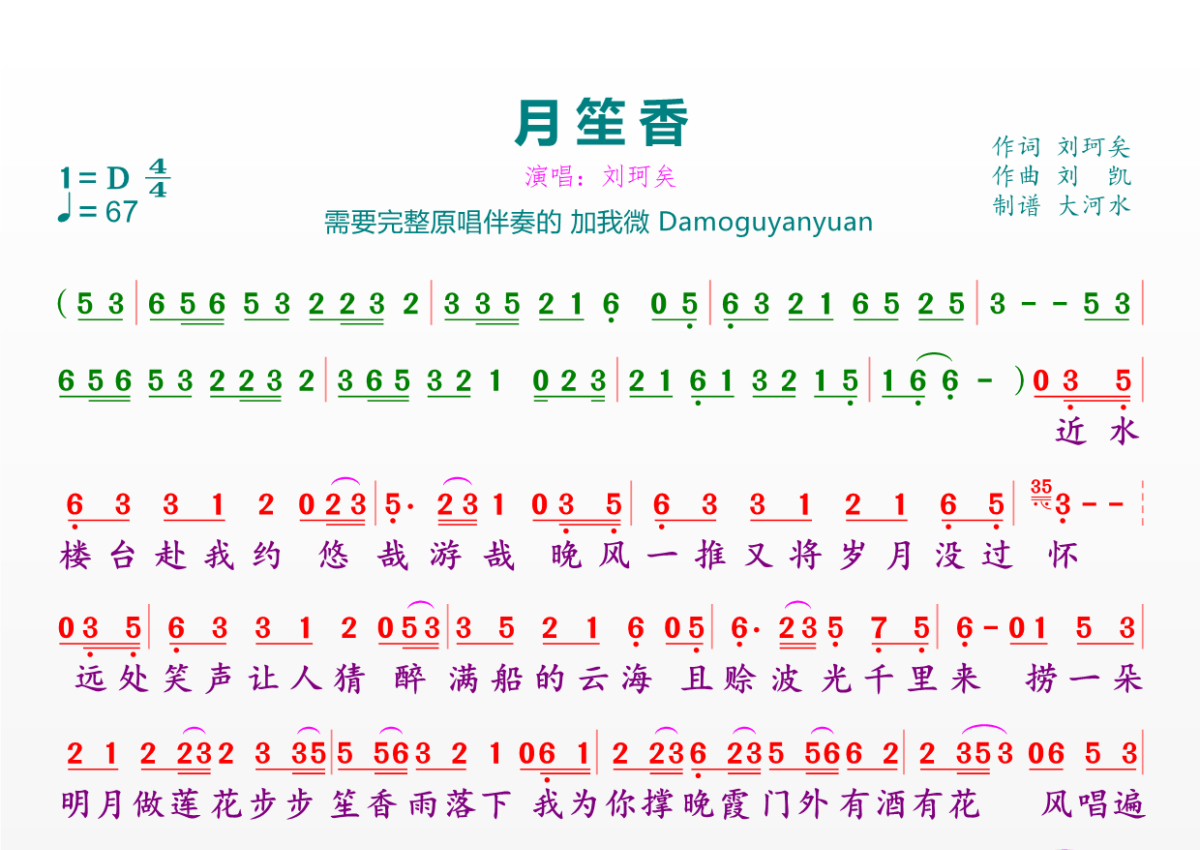 《月笙香》是刘珂矣演唱的一首歌曲,拍号为4/4拍,歌曲速度为每分钟67拍,这份简谱共有一张高清图谱,图谱由 @临海雪原 编配上传。