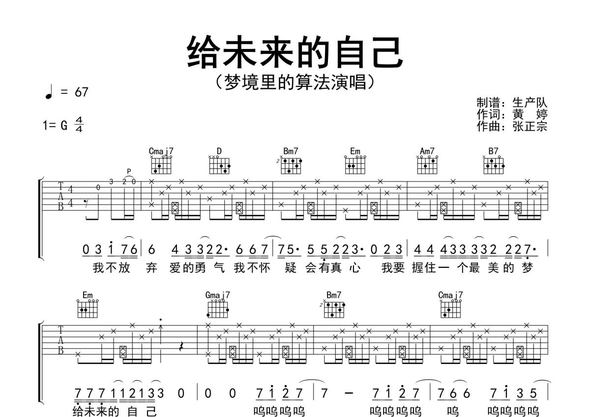 《给未来的自己》是梦境里的算法演唱的一首歌曲,精编完美版,拍号为4/4拍,歌曲速度为每分钟67拍,歌曲原调为G调,本吉他谱采用的是G调指法编配,演奏时不需要使用变调夹即为原调,这份吉他谱共有三张高清图谱,图谱由 @生产队 编配上传,图谱使用六线谱编配,包含吉他和弦指法、简谱以及歌词部分,使用这份给未来的自己吉他谱,可以让你更加方便地掌握这首歌曲的弹唱技巧,快来尝试吧。梦境里的算法演唱的歌曲《给未来的自己》原版吉他谱,采用拍弦节奏原版编配,优质推荐!。