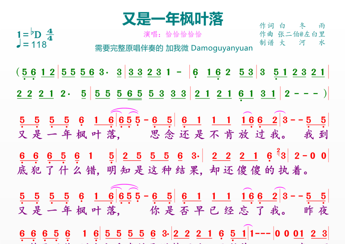 《又是一年枫叶落》是恰恰恰恰恰演唱的一首歌曲,拍号为4/4拍,歌曲速度为每分钟118拍,这份简谱共有一张高清图谱,图谱由 @临海雪原 编配上传。