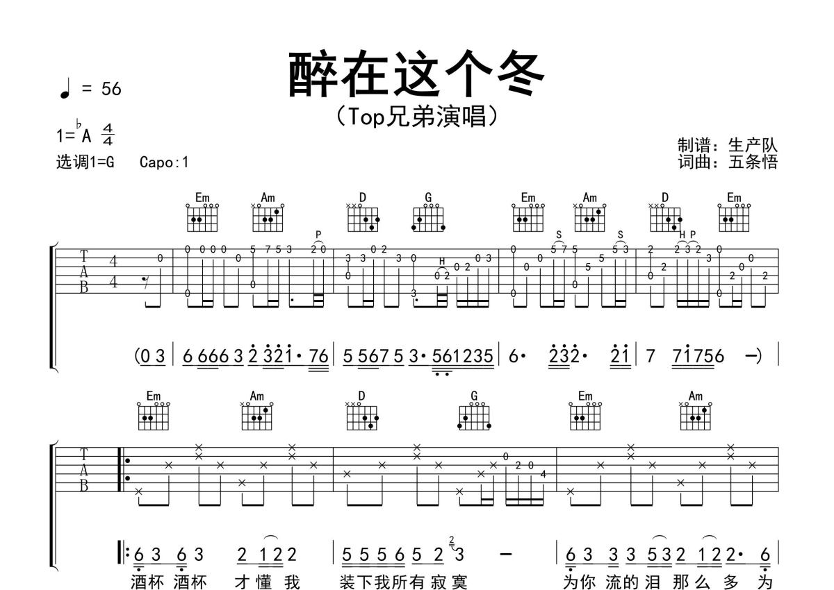 《醉在这个冬》是Top兄弟演唱的一首歌曲,精编完美版,拍号为4/4拍,歌曲速度为每分钟56拍,歌曲原调为Ab调,但由于原调指法比较难,为了方便弹奏,本吉他谱采用的是G调指法编配,变调夹1品弹奏即为原调,当然也可以根据自己的音域改变变调夹位置,或者通过改变和弦调性,以方便自己弹奏,这份吉他谱共有两张高清图谱,图谱由 @生产队 编配上传,图谱使用六线谱编配,包含吉他和弦指法、简谱以及歌词部分,使用这份醉在这个冬吉他谱,可以让你更加方便地掌握这首歌曲的弹唱技巧,快来尝试吧。Top兄弟演唱的歌曲《醉在这个冬》原版吉他谱,含精准的前奏、间奏、尾奏solo编配,精编完美版,优质推荐!。