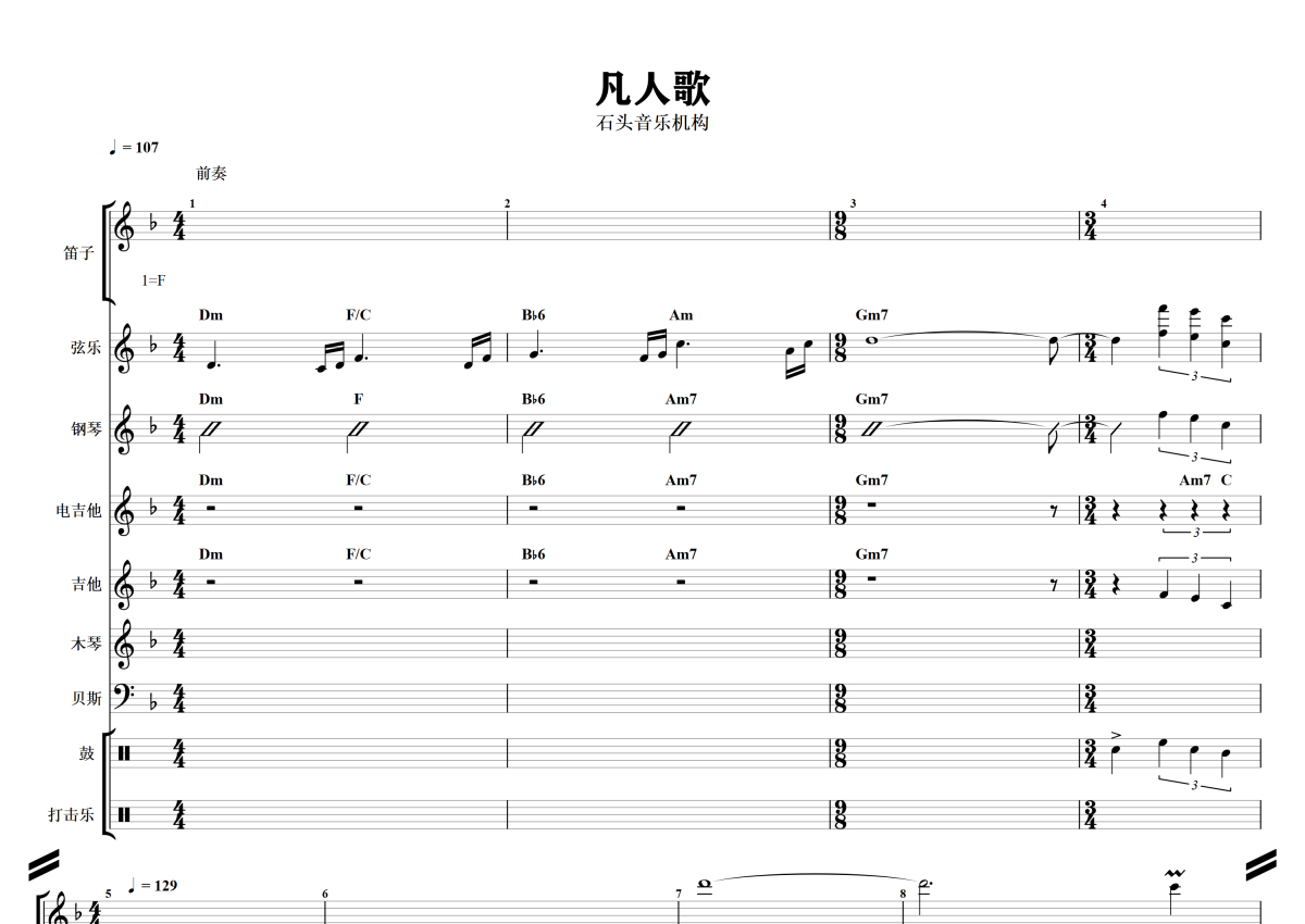 《凡人歌》是李宗盛演唱的一首歌曲,石头音乐原版记谱,拍号为4/4拍,歌曲速度为每分钟107拍,这份乐队总谱共有十张高清图谱,图谱由 @石头音乐 编配上传。