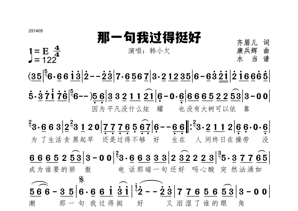 《那一句我过得挺好》是韩小欠演唱的一首歌曲,拍号为4/4拍,歌曲速度为每分钟122拍,这份简谱共有一张高清图谱,图谱由 @水当 编配上传。