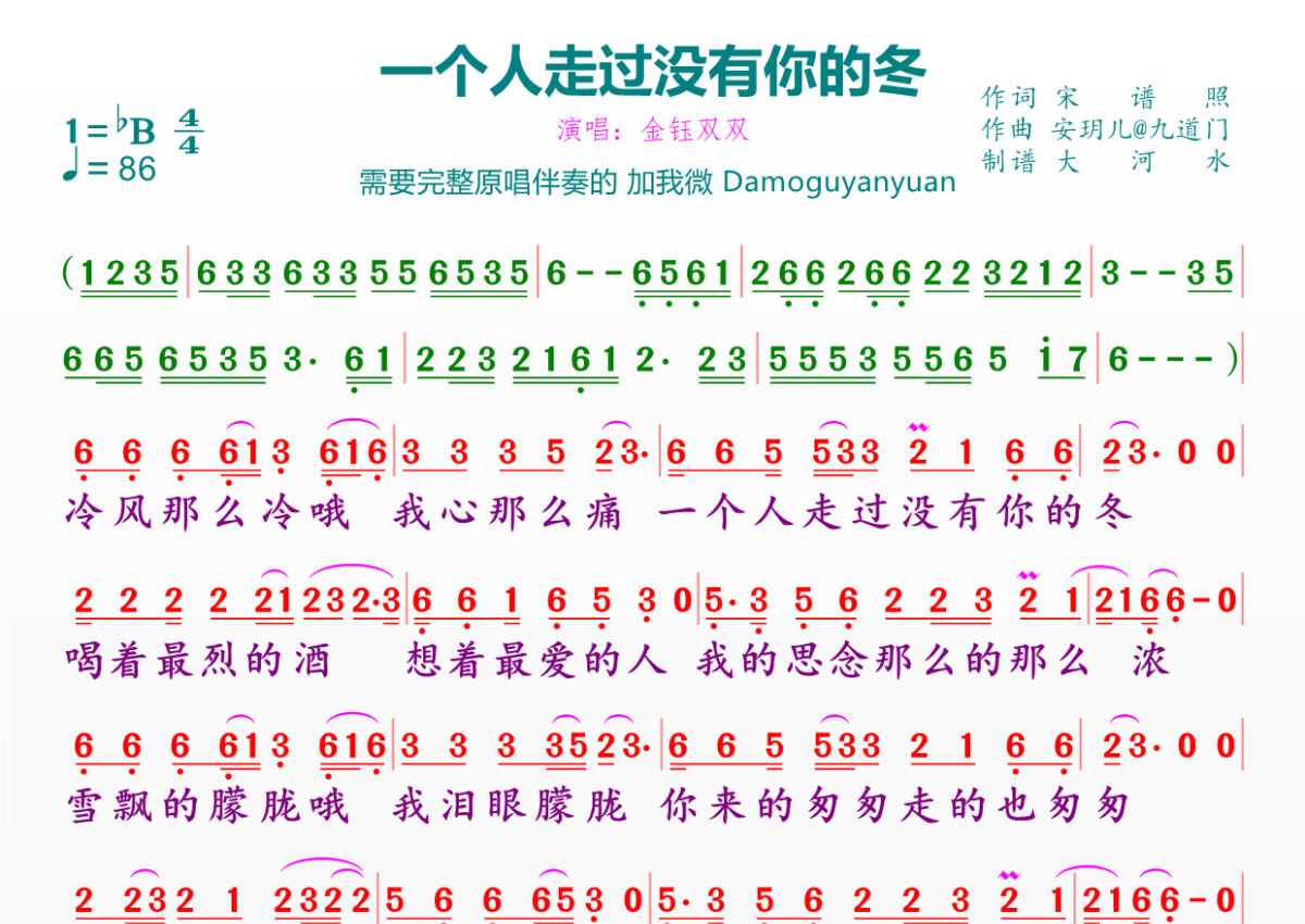 《一个人走过没有你的冬》是金钰双双演唱的一首歌曲,拍号为4/4拍,歌曲速度为每分钟86拍,这份简谱共有一张高清图谱,图谱由 @临海雪原 编配上传。
