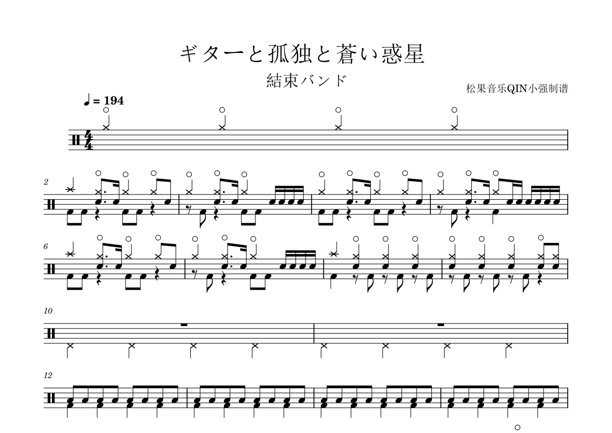 《吉他与孤独与蓝色星球》是纽带乐队演唱的一首歌曲,拍号为4/4拍,这份架子鼓谱共有四张高清图谱,图谱由 @松果音乐QIN小强 编配上传,图谱使用五线谱编配,使用这份吉他与孤独与蓝色星球架子鼓谱,你将能够轻松地敲打出这首纽带乐队的吉他与孤独与蓝色星球,快来尝试吧。《吉他与孤独与蓝色星球》是纽带乐队(結束バンド)演唱的歌曲,由ZAQ作词、音羽-otoha-作曲、akkin编曲,于2022年11月6日以数字单曲形式发行,后收录于乐队同年12月25日发行的首张录音室专辑《纽带乐队》中该曲为TV动画《孤独摇滚!》剧中插曲,歌曲时长为3分48秒。该曲目在音乐游戏《osu!Skills》中作为可演奏曲目出现,用户Vagouuu于2023年在该平台使用[Noise]难度进行演奏并取得98.97%的得分。歌曲名称包含日语原名“ギターと孤独と蒼い惑星”,对应罗马音为“Guitar to Kodoku to Aoi Hoshi”。
