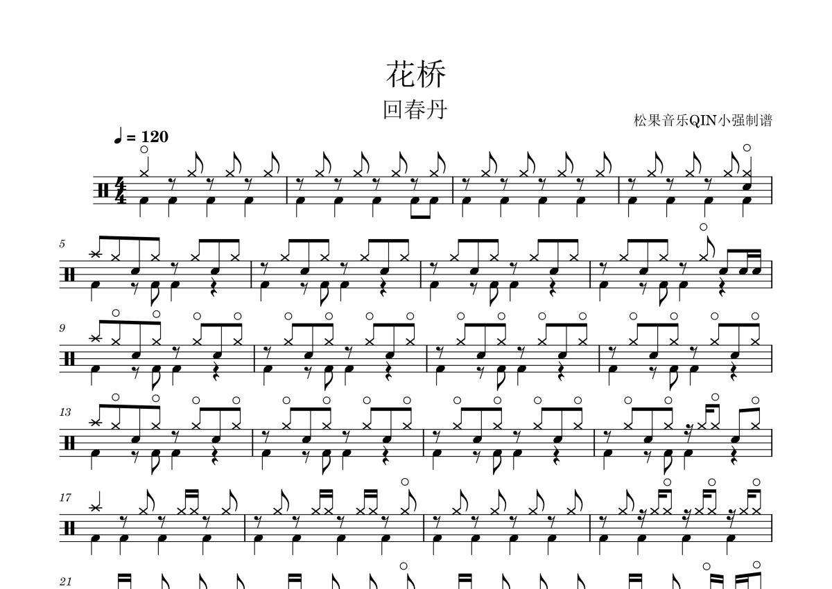 《花桥》是回春丹演唱的一首歌曲,拍号为4/4拍,这份架子鼓谱共有两张高清图谱,图谱由 @松果音乐QIN小强 编配上传,图谱使用五线谱编配,使用这份花桥架子鼓谱,你将能够轻松地敲打出这首回春丹的花桥,快来尝试吧。花桥回春丹乐队。
