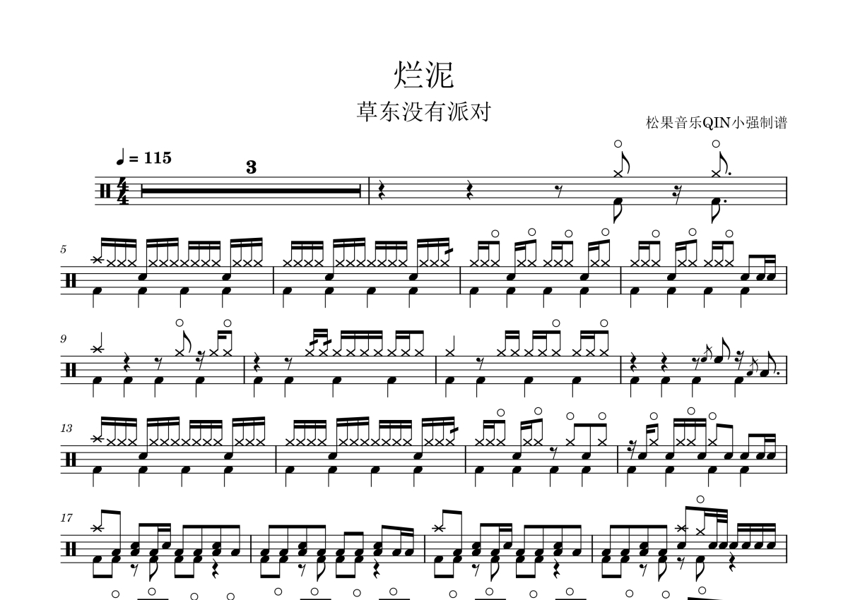 《烂泥》是草东没有派对演唱的一首歌曲,拍号为4/4拍,这份架子鼓谱共有两张高清图谱,图谱由 @松果音乐QIN小强 编配上传,图谱使用五线谱编配,使用这份烂泥架子鼓谱,你将能够轻松地敲打出这首草东没有派对的烂泥,快来尝试吧。